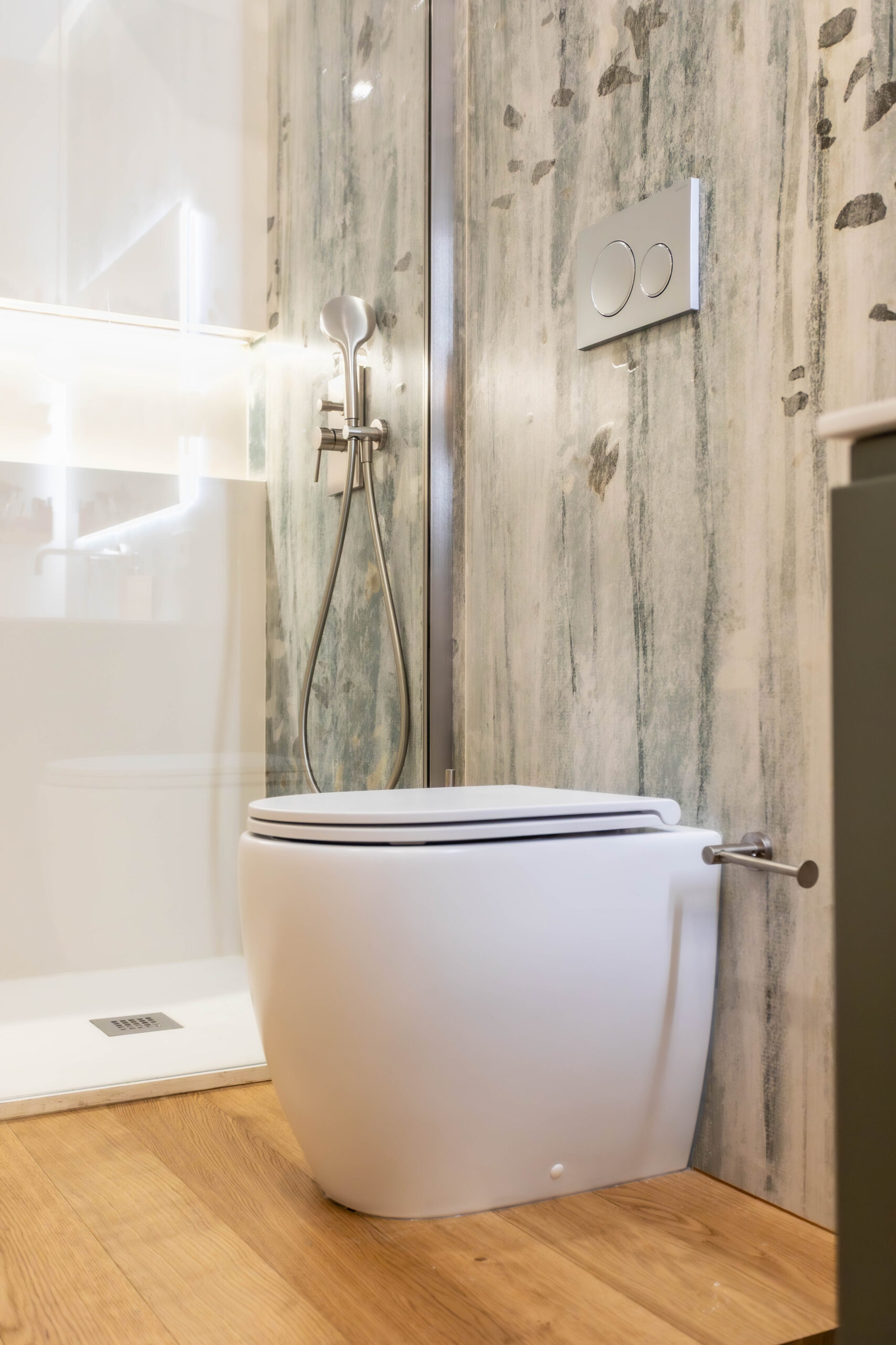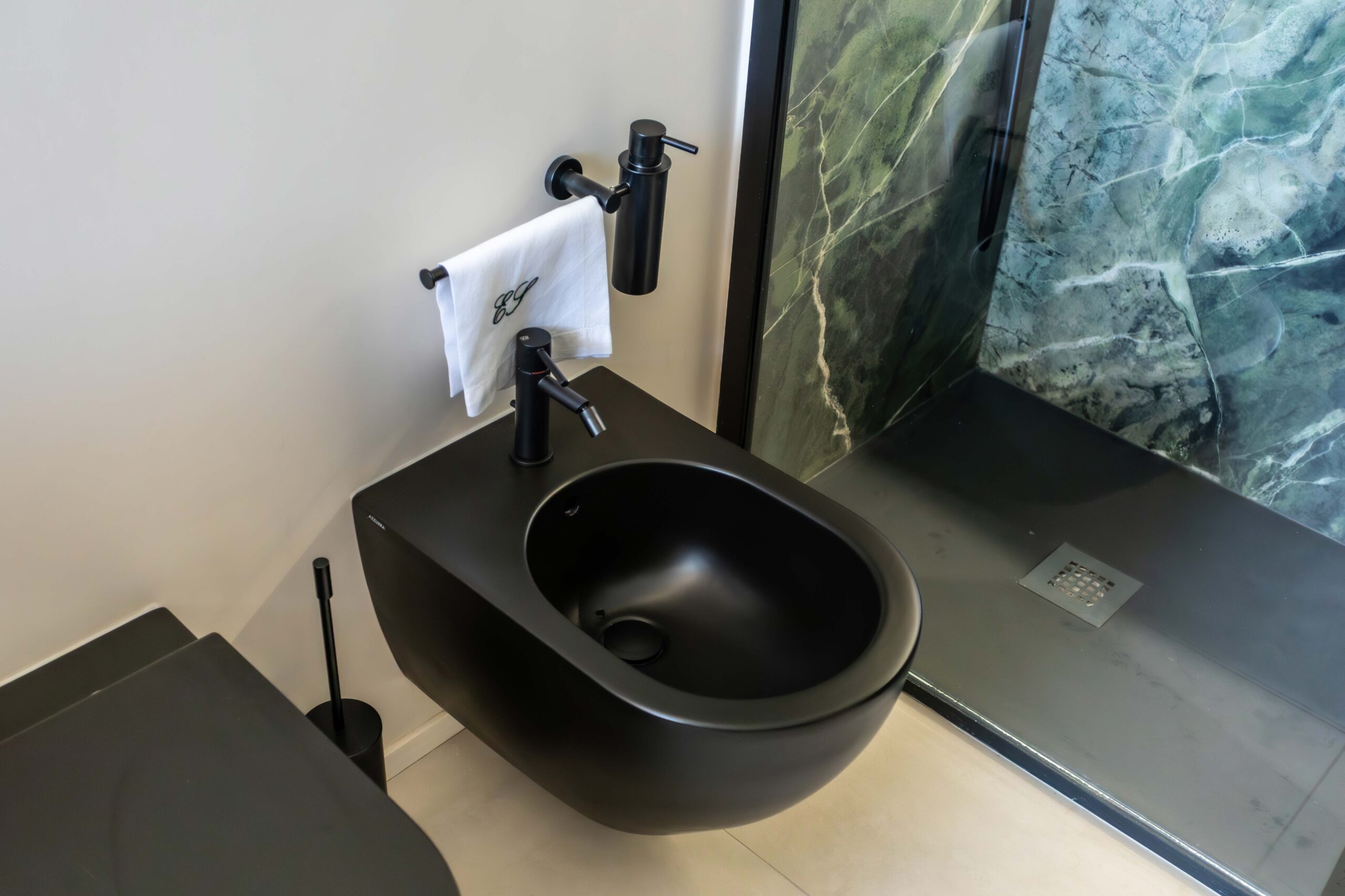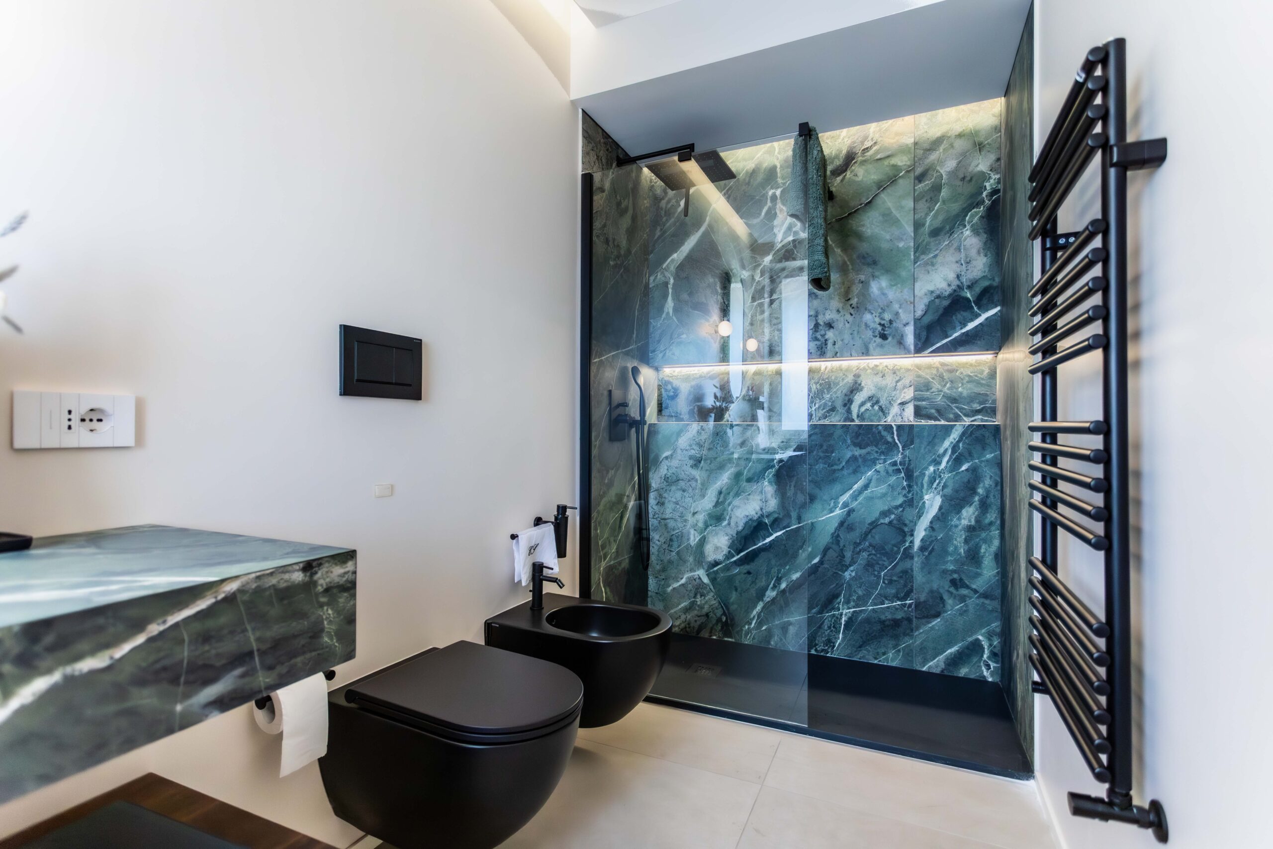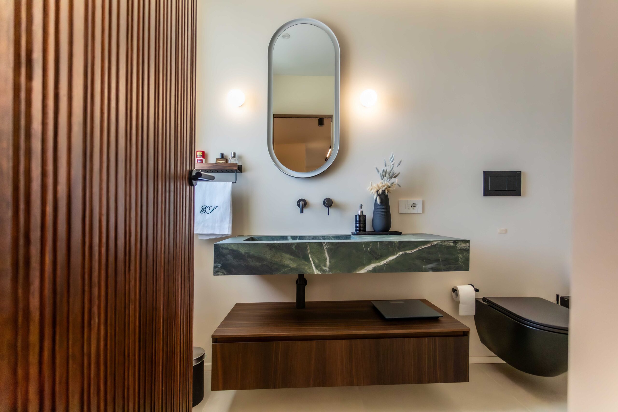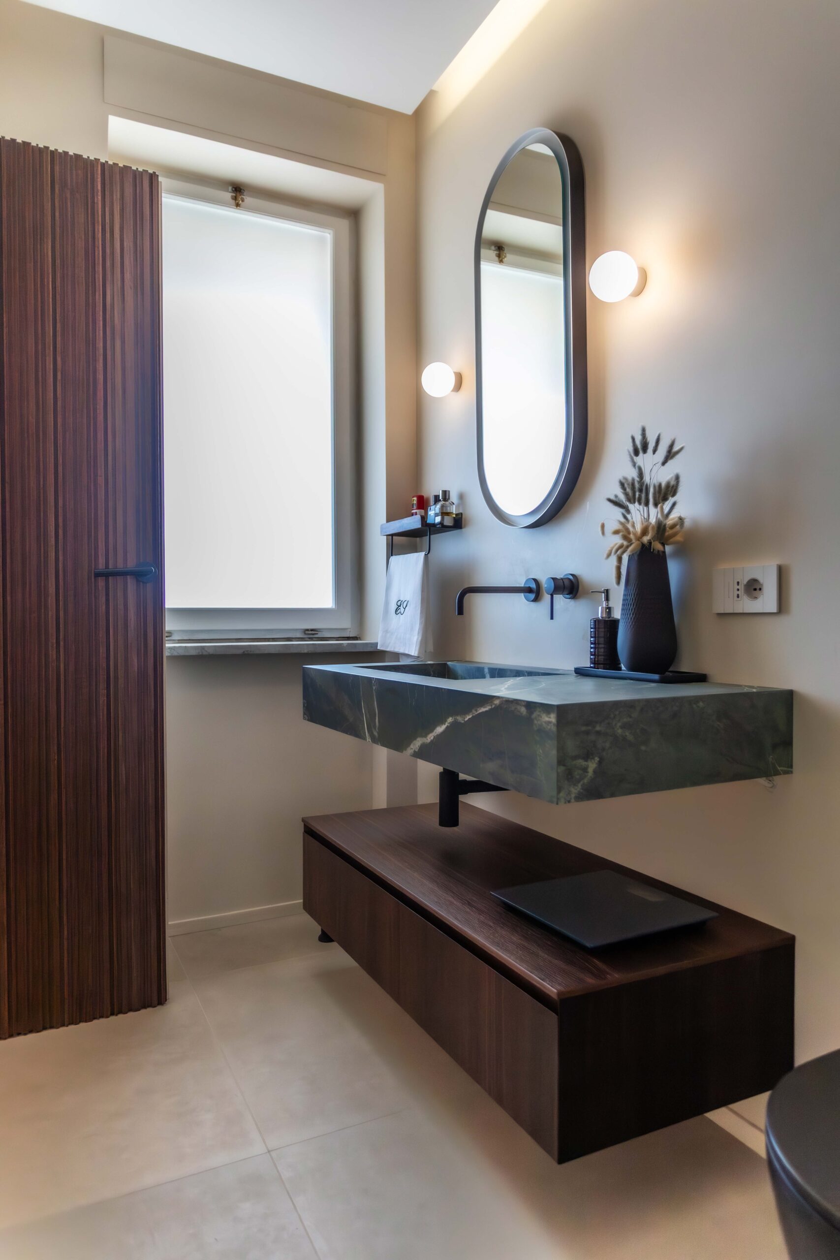 L’arredo bagno è definito da scelte di design essenziali ma ricercate: i sanitari Azzurra Ceramica serie Comoda e la rubinetteria Gessi serie Emporio coniugano estetica e comfort, mentre i mobili Arbi serie Street interpretano la funzionalità con linee pulite e moderne. I termoarredi Antrax serie Lana e Irsap serie Arpa 12 aggiungono un tocco di eleganza tecnologica, diventando veri e propri elementi d’arredo.