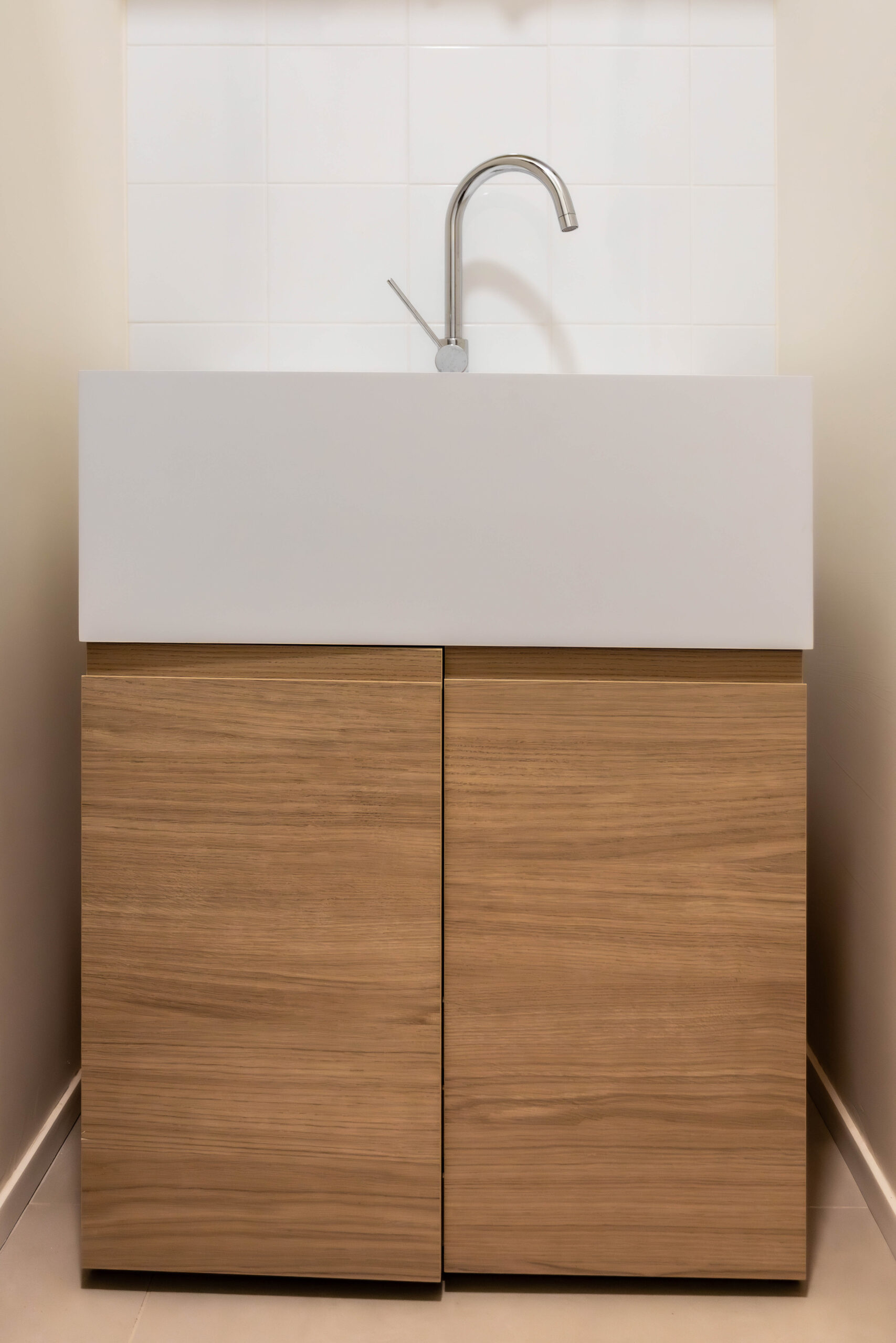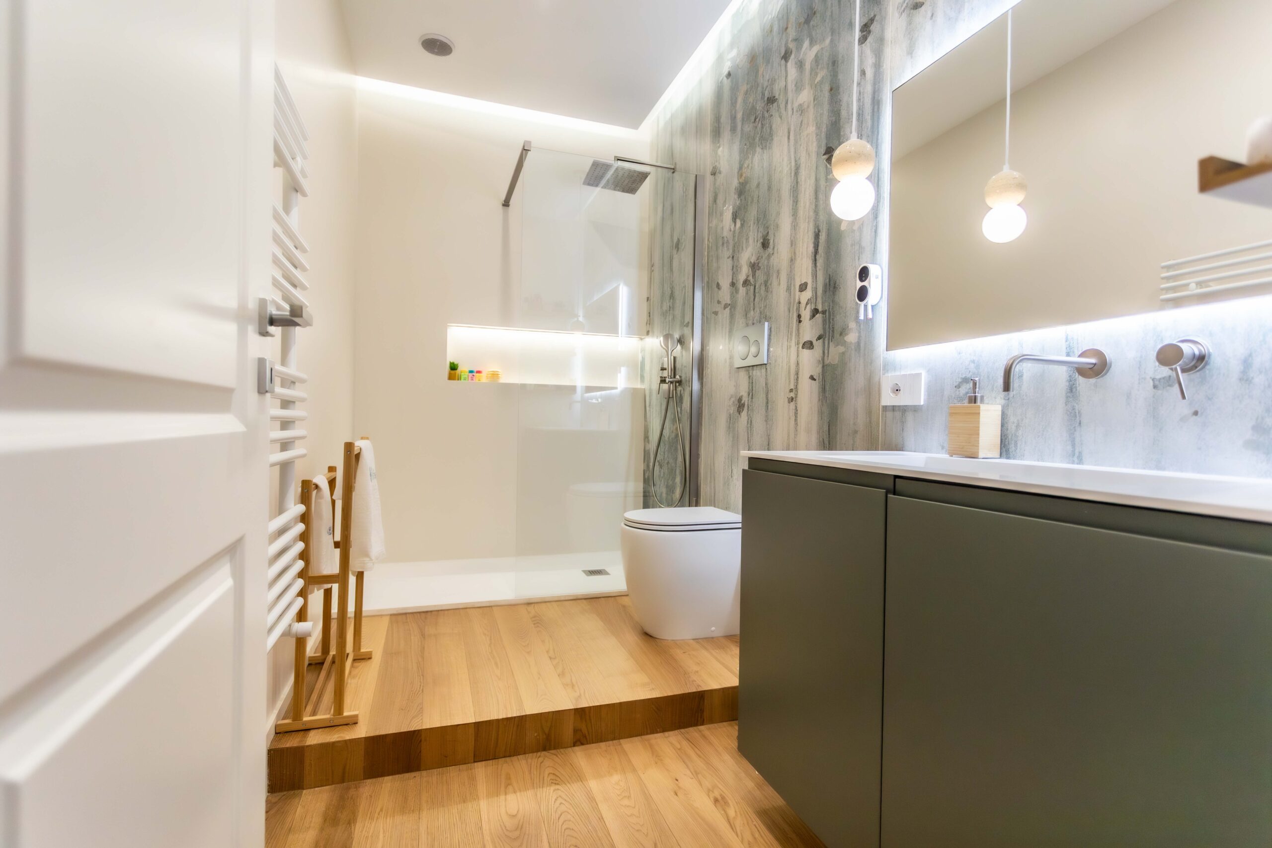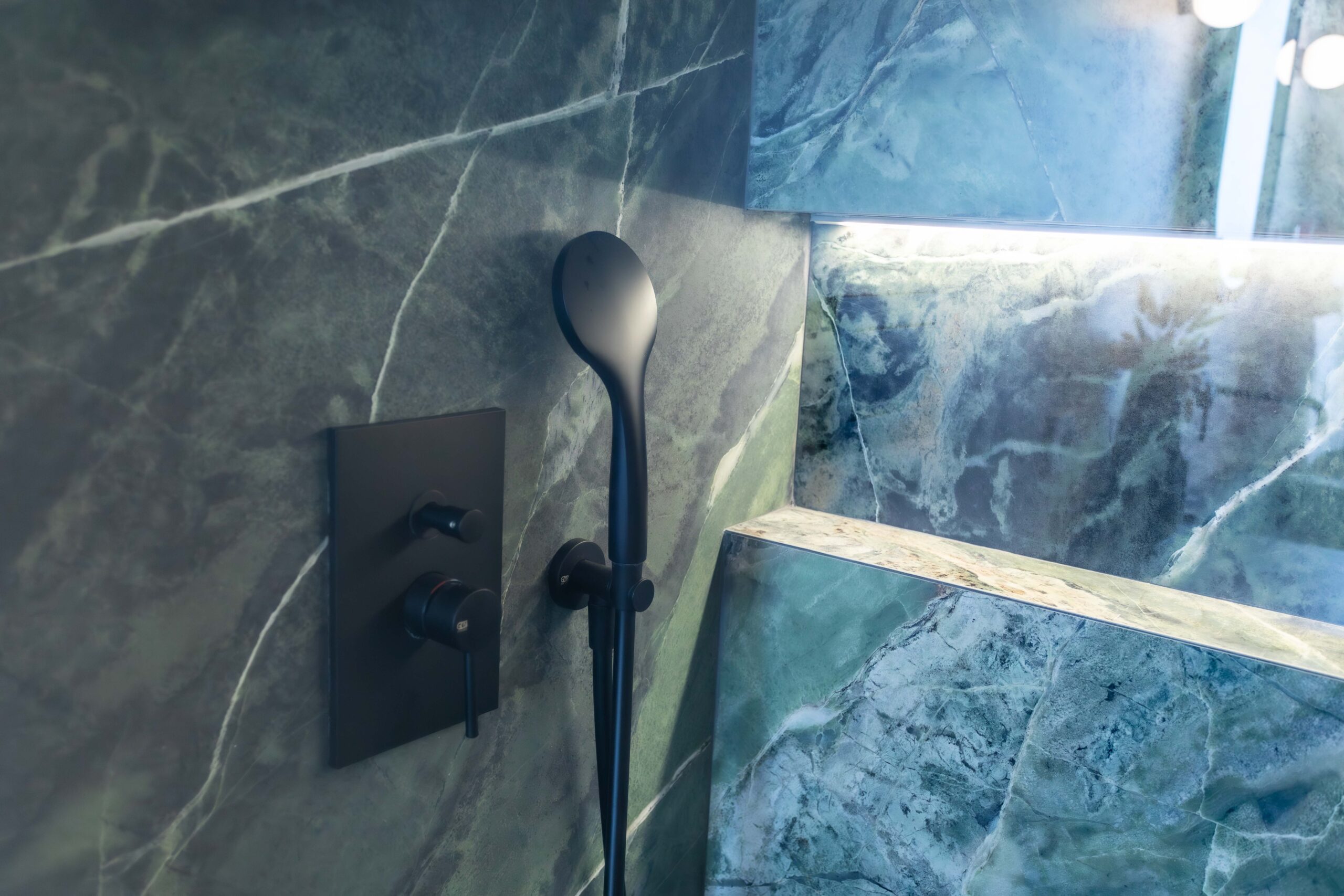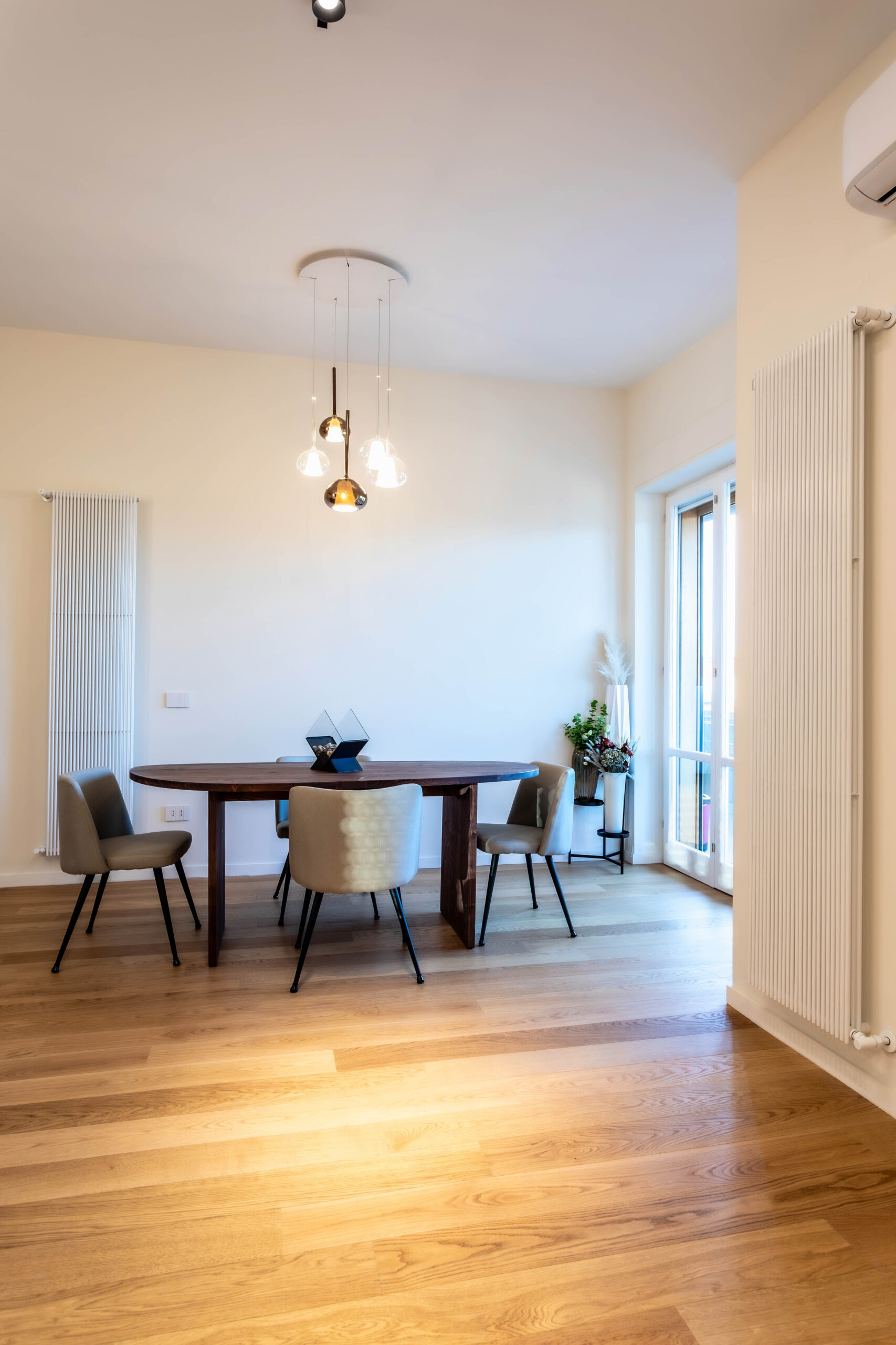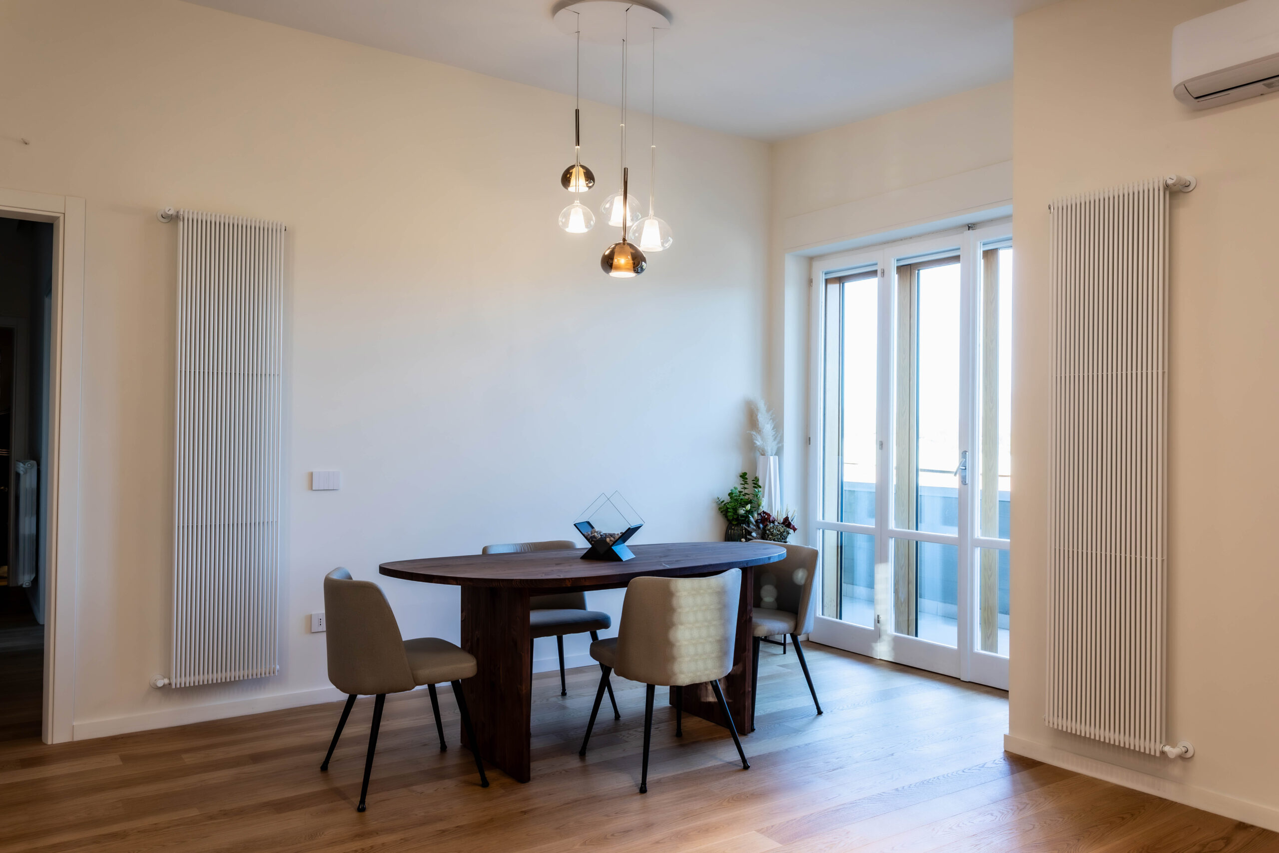 L’arredo bagno è definito da scelte di design essenziali ma ricercate: i sanitari Azzurra Ceramica serie Comoda e la rubinetteria Gessi serie Emporio coniugano estetica e comfort, mentre i mobili Arbi serie Street interpretano la funzionalità con linee pulite e moderne. I termoarredi Antrax serie Lana e Irsap serie Arpa 12 aggiungono un tocco di eleganza tecnologica, diventando veri e propri elementi d’arredo.