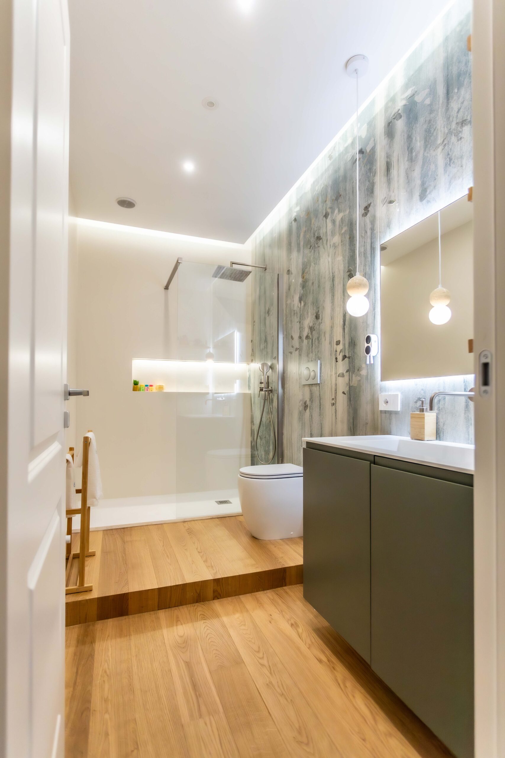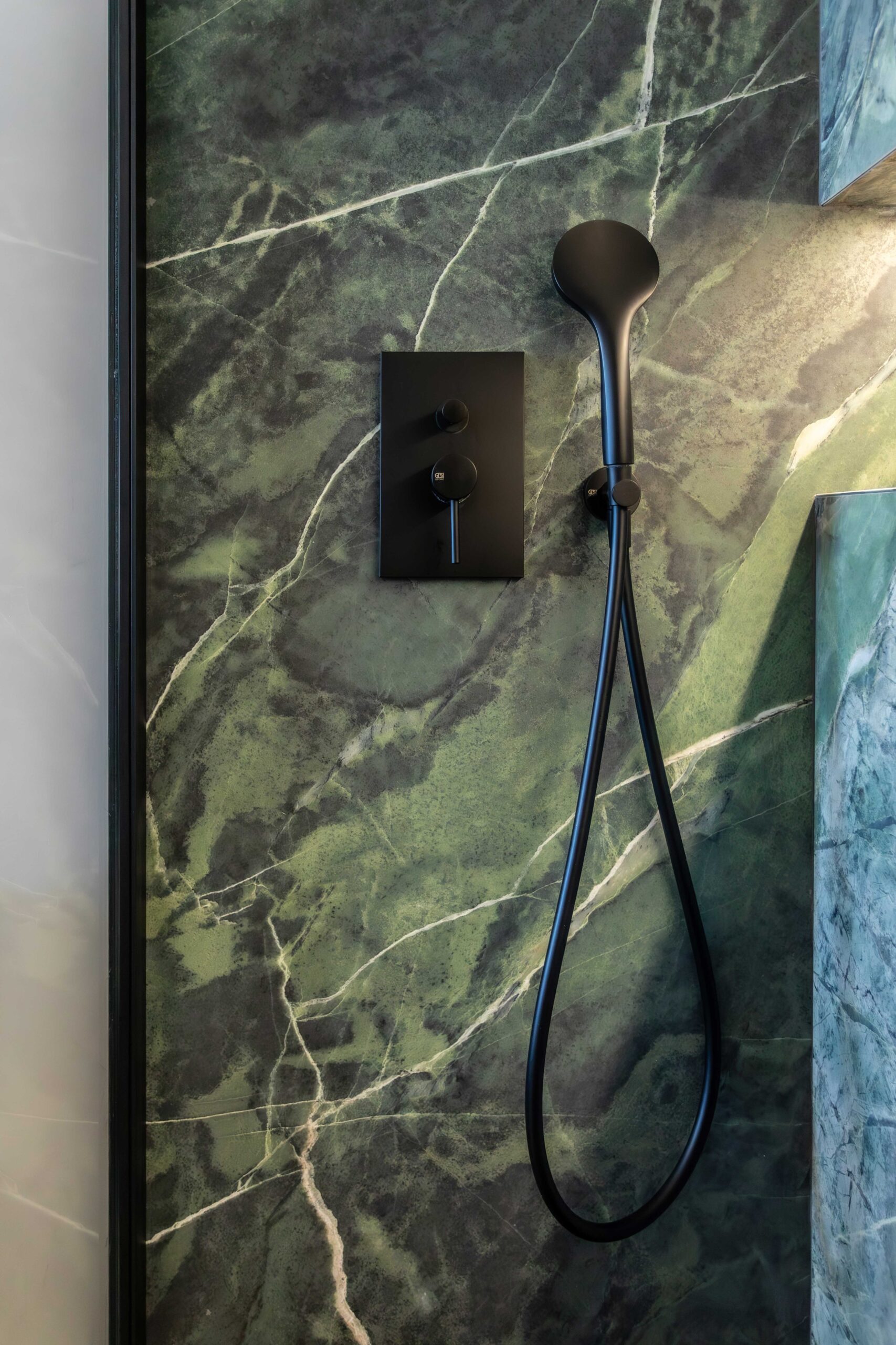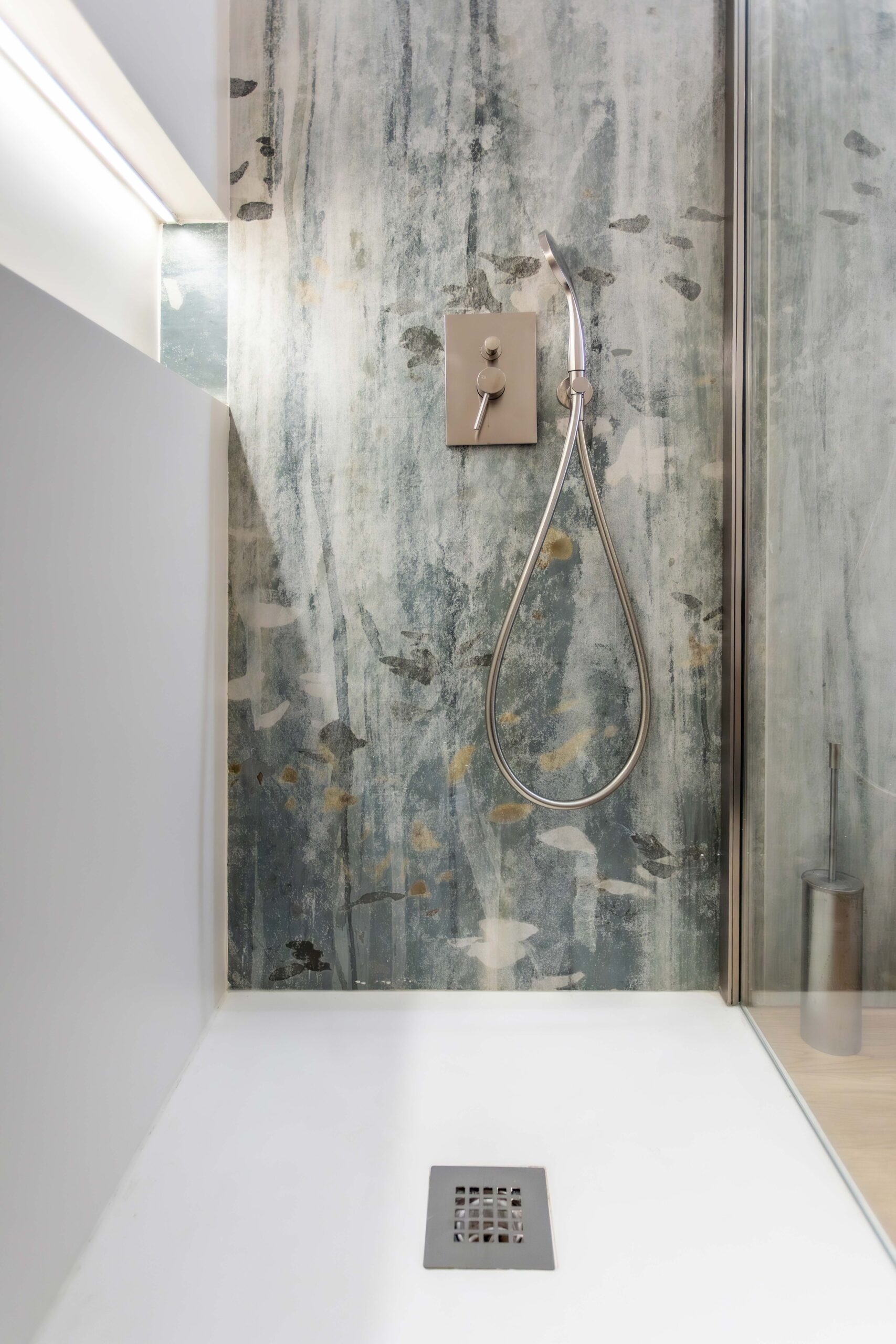 Il parquet in rovere naturale Bauwerk avvolge gli spazi con calore e autenticità, mentre i rivestimenti FAP Ceramiche della serie Trees e Flor Gres della serie Heritage arricchiscono le pareti con texture raffinate e giochi di luce che creano continuità tra gli ambienti. La resina Kerakoll Wallpaper e la boiserie Atelier Casabella completano l’insieme con un tocco decorativo dal carattere materico e contemporaneo.